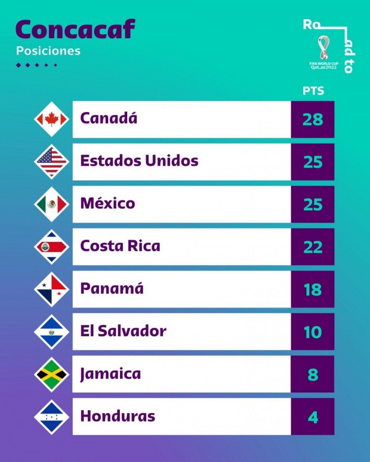 3月28日讯 中北美区世预赛倒数第二轮战罢,加拿大获得直通世界杯资格。美国、墨西哥、哥斯达黎加在本轮全部取胜。目前美国、墨西哥同积25分,美国凭借净胜球优势位居第二。哥斯达黎加积22分位列第四。